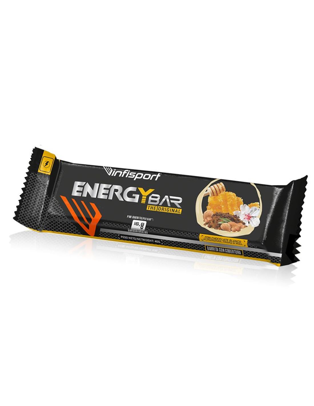 Infisport Energy Bar es una barrita energética fabricada con maltodextrinas, cereales, almendras, pasas, arroz hinchado y miel, recubierta por chocolate blanco, que proporciona energía natural de una forma rápida y sostenida. Está enriquecida con vitaminas, minerales y antioxidantes.